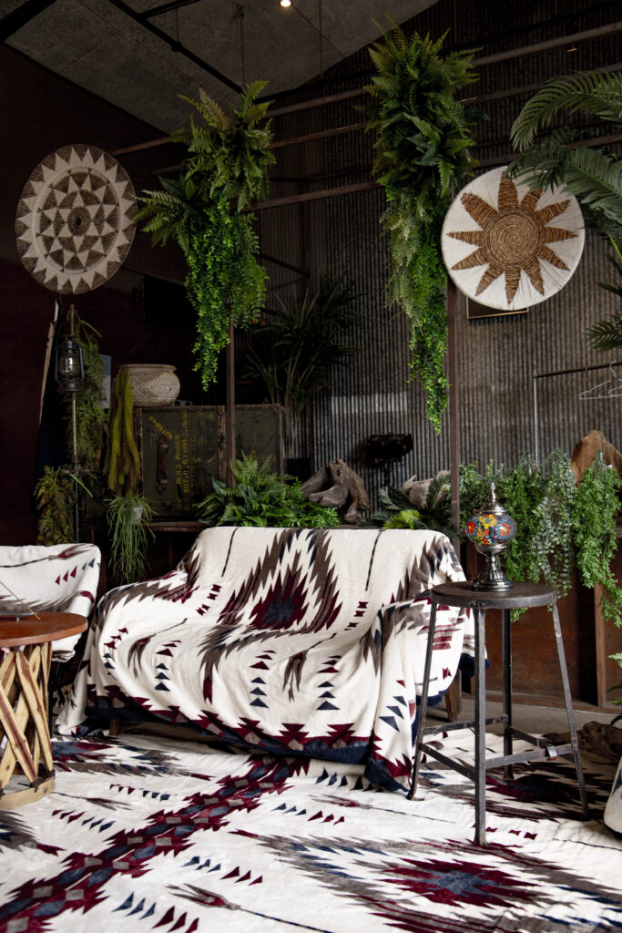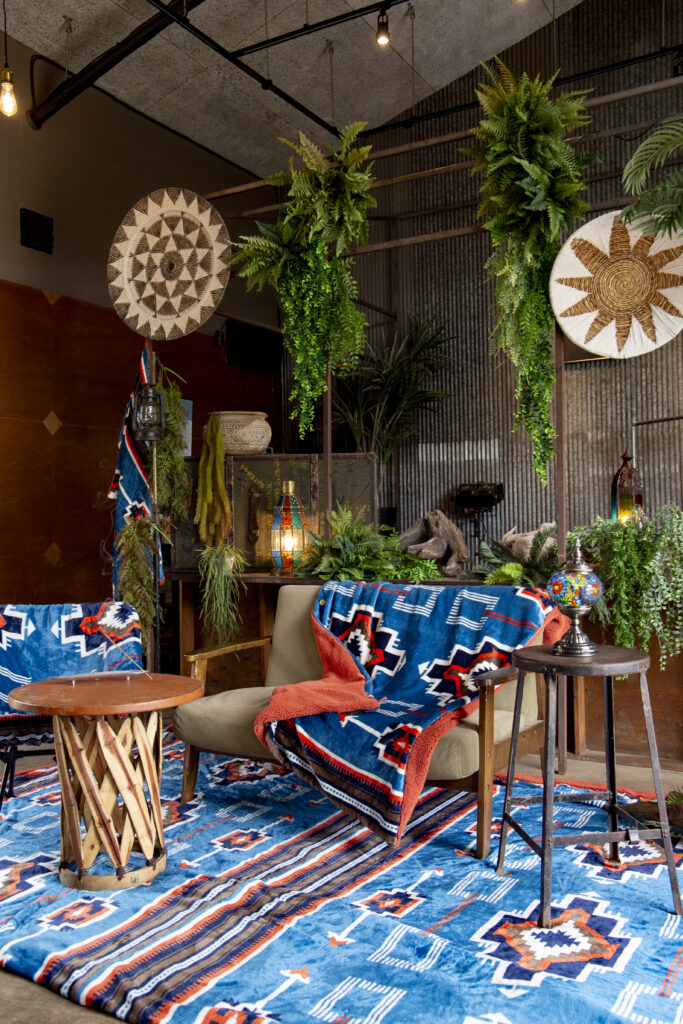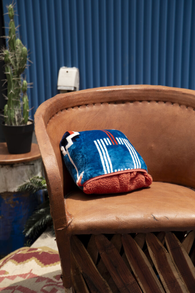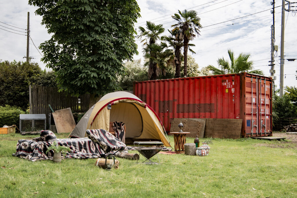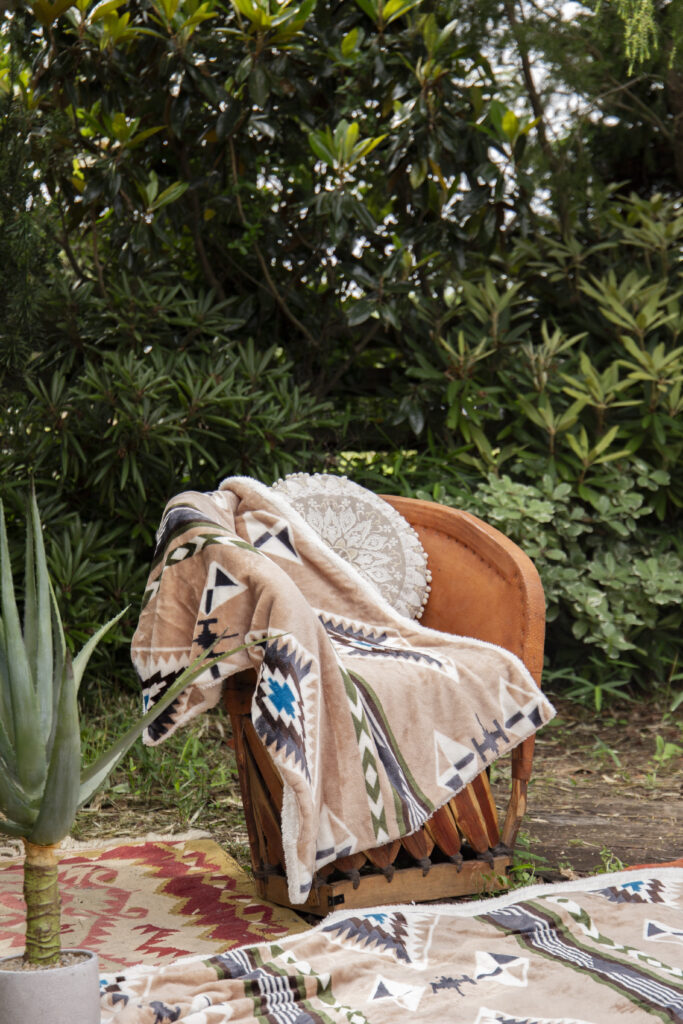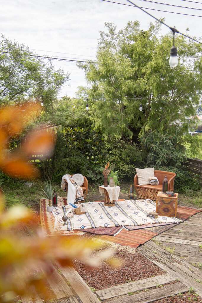 鮮やかな色味で個性あふれるエスニックなデザインが、LAND KNOTの豊かな自然やガレージ風の背景にマッチ。 広い芝生エリアやコンテナを生かし、家具やアウトドア用品をお持ち込みいただいてのキャンプシーンとブランケットの相性も素敵です。